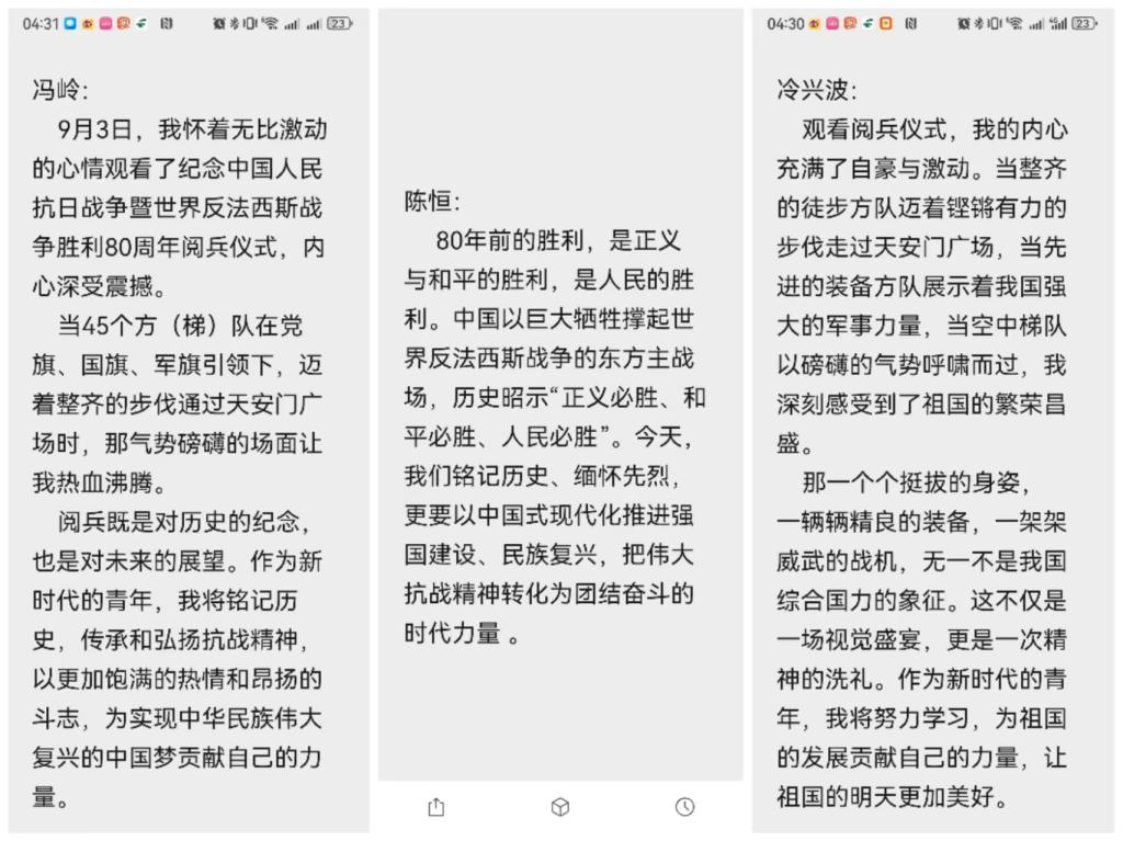 直播结束后,师生们心潮澎湃,意犹未尽,纷纷围绕阅兵仪式展现的新装备、新面貌和新气象展开热烈讨论和交流。一位青年教师感慨道:“这是一堂生动、深刻的爱国主义教育课。它让我们再次深刻认识到抗战胜利的伟大意义,感受到了国家发展的辉煌成就和人民军队的威武雄壮。”2023级学生穆同学表示:“太震撼了!当新型大国重器威严驶过天安门,我深刻感受到祖国科技的飞速发展与国防力量的日益强大。作为一名机械专业的学生,我将刻苦钻研专业知识,将所学融入“中国智造”的伟大实践,为实现中华民族的伟大复兴贡献自己的青春与智慧!”