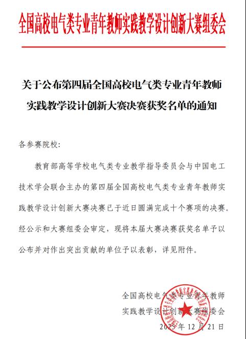近日,2025年第四届全国高校电气类专业青年教师实践教学设计创新大赛决赛在浙江温州圆满落幕。大赛由教育部高等学校电气类专业教学指导委员会、中国电工技术学会主办。本次大赛共有10个赛项,522支队伍报名,306支队伍晋级决赛,选手来自全国21个省市。我校机电工程学院鞠晓君、晋宏炎、昝玉鹏老师组成的教学团队凭借《基于机智云的嵌入式系统实训开发平台》项目,在“电气自动化系统创新设计竞赛”赛道中荣获全国总决赛二等奖。