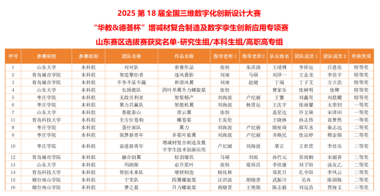 近日,由全国三维数字化创新设计大赛组委会主办,山东大学机械工程学院承办的2025第18届全国三维数字化创新设计大赛“华教&德荟杯”增减材复合制造及数字孪生技术创新应用专项赛(山东赛区)在山东大学顺利举办。本届“华教&德荟杯”增减材专项赛以“智创融合・孪生赋能”为主题,旨在培养大学生创新创造精神与实践能力,提升大学生的创新设计、系统设计、实践动手等能力,携手打造具备数智素养,有创意想法、有创新能力、有创造精神、有创业思维的新质人才。我校机电工程学院学子斩获特等奖一项、一等奖一项、二等奖三项。