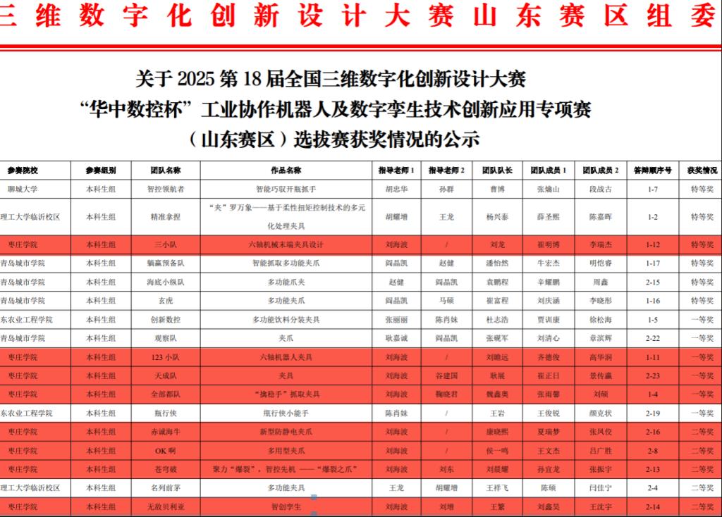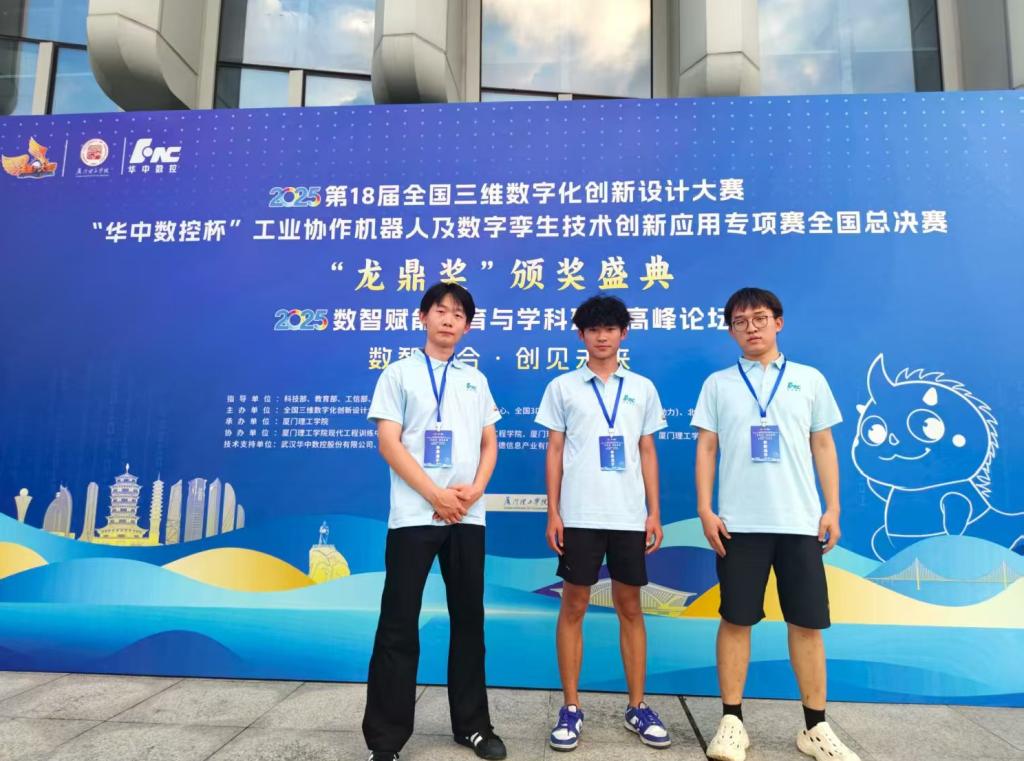 8月18日至8月19日,2025第18届全国3D大赛“华中数控杯”工业协作机器人及数字孪生技术创新应用专项赛全国总决赛在厦门理工学院举行。由我校机电工程学院的刘龙、崔明博、刘瞻远团队在历经省赛、国赛,从3000余支队伍中脱颖而出,斩获全国总决赛三等奖。同时我校机电工程学院学子在山东赛区中取得一个省级特等奖、三个省级一等奖、四个省级二等奖的优异成绩。