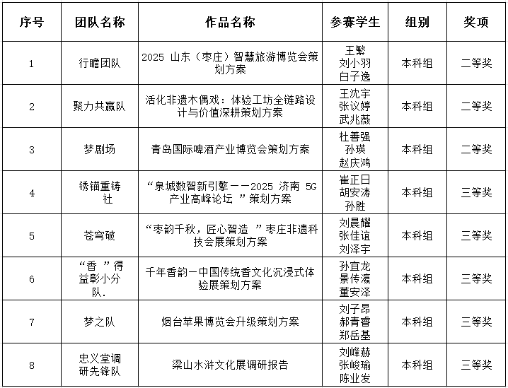 入围会展策划赛道全国总决赛的作品是:《2025山东(枣庄)智慧旅游博览会策划方案》《青岛国际啤酒产业博览会策划方案》以及《活化非遗木偶戏:体验工坊全链路设计与价值深耕策划方案》。