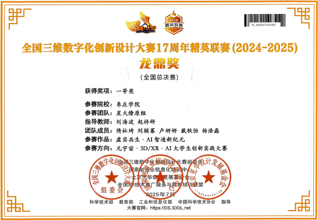 近日,由全国三维数字化创新设计大赛组委会主办的2025全国三维数字化创新设计大赛17周年精英联赛总决赛顺利落幕。我院在创新创业学院的精心指导下,组织各专业学生参赛,综合运用三维建模、3D打印、3D扫描、有限元分析、AIGC等知识和技术,经过激烈的角逐,我校机电工程学院学子斩获一等奖一项、二等奖四项、三等奖六项。